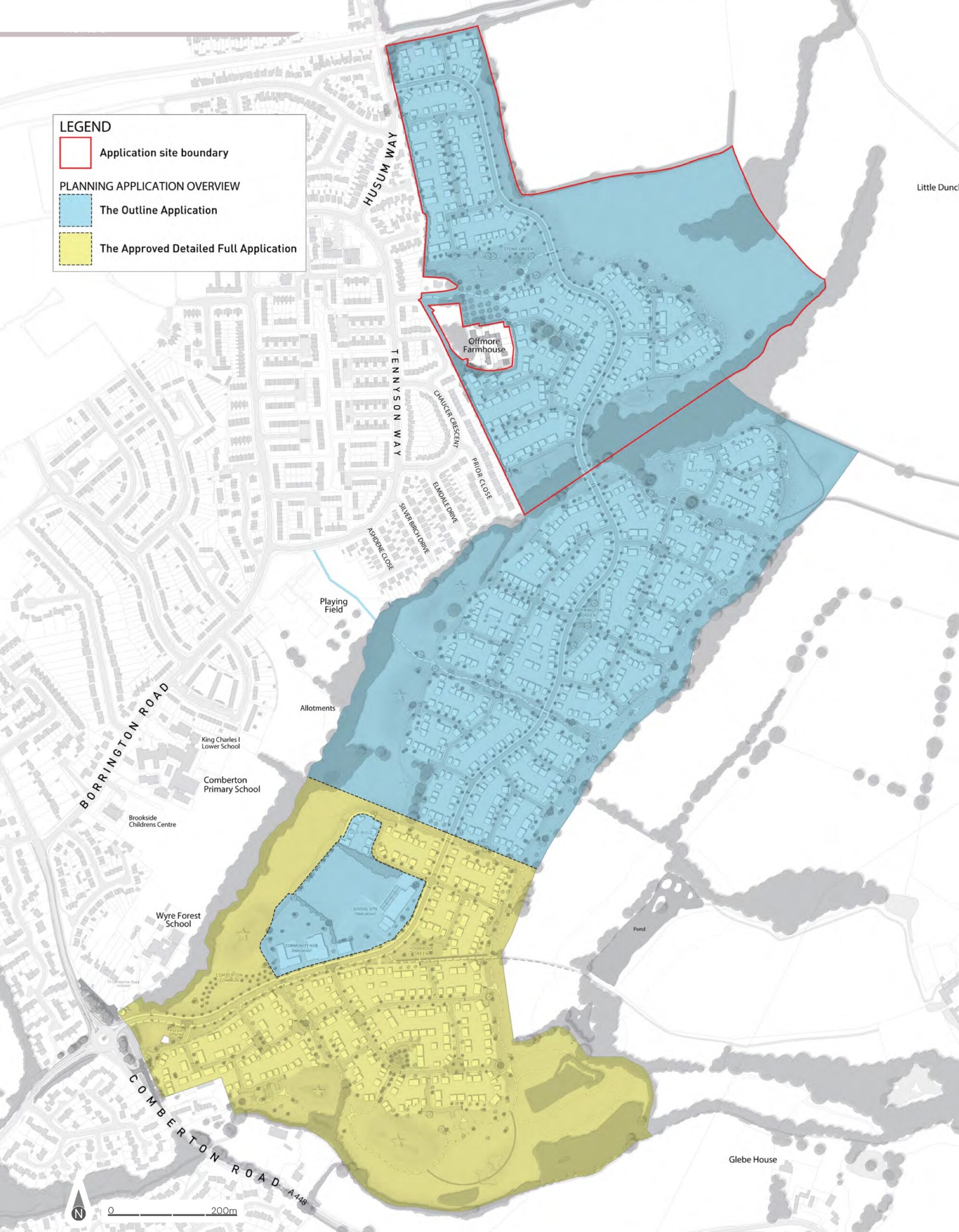 Hybrid planning permission was granted in 2025 (ref. 22/0226/EIA) for a residential-led, mixed-use development east of Kidderminster. The permission granted full approval for Phase 1 (395 homes) and outline approval for the remaining phases, allowing up to 1,055 homes. In total, the hybrid application provides for up to 1,450 homes across the entire site.